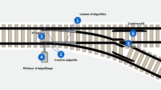 1. Les lames d’aiguilles : deux rails mobiles qui orientent les essieux du train vers la voie choisie