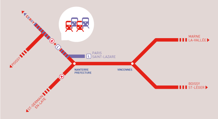 Si l’on se réfère à la A en termes de forme géométrique, parler de « ligne » ne correspond pas vraiment au réseau du RER A. En effet, notre « ligne » est en fait composée de 5 branches qui sillonnent 7 départements… Cela implique des points de convergence à la jonction entre ces branches, qui sont autant de points sensibles pour la circulation des trains. Côté ouest, on y ajoute la convergence avec la ligne L, après Nanterre Préfecture, comme le montre très simplement le schéma ci-dessous :