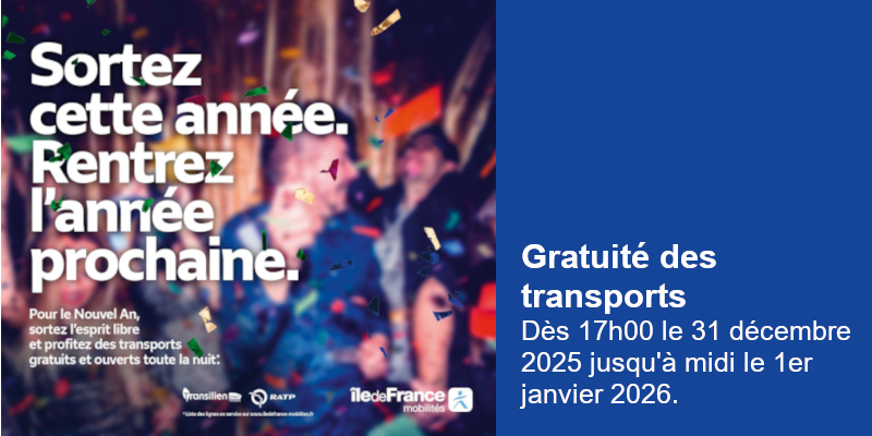 Comme chaque année, Île-de-France Mobilités, Transilien SNCF Voyageurs et la RATP vous accompagnent pour célébrer le passage à la nouvelle année en toute sérénité.