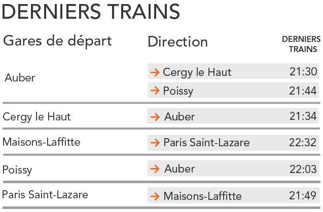 Pour bien comprendre : l’horaire indiqué est celui du départ du train dans la gare de départ, c’est-à-dire le train quittant Auber à 21h30 (arrivée à Cergy le Haut à 22h12)