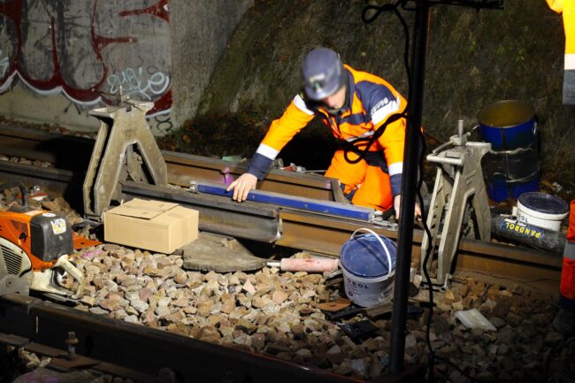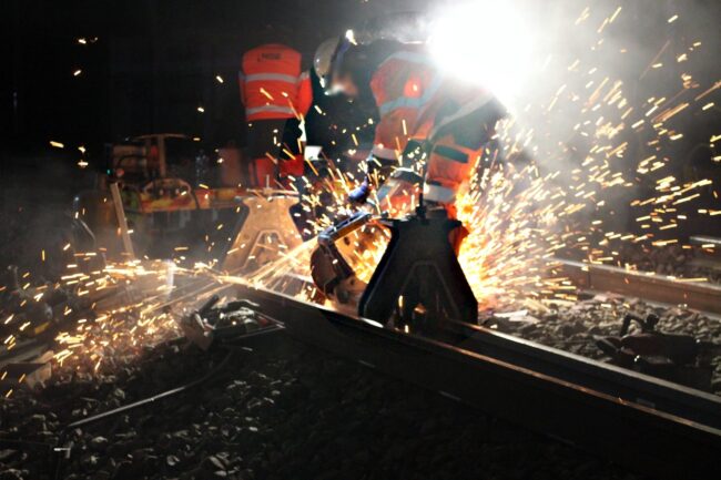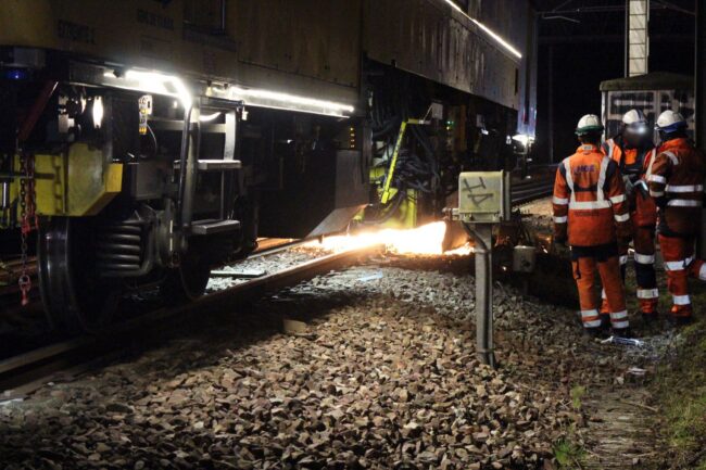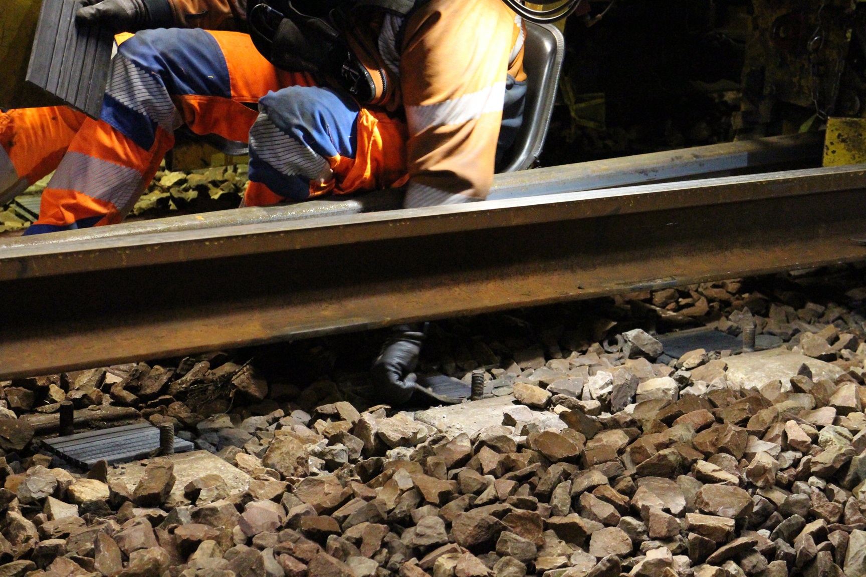Ici, une personne prépare l’aplomb et le niveau des rails (l’ancien et le nouveau) afin de pouvoir le souder. Cette fois-ci, ce ne sera pas une soudure électrique, mais une soudure aluminothermique, un procédé permettant de monter la température à plus de 2 800°C pour assurer une soudure bout-à-bout parfaite.