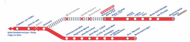 Du 8 au 23 août inclus, le trafic sera interrompu toute la journée entre Vincennes et Noisy-le-Grand–Mont d’Est pour effectuer le renouvellement de plusieurs appareils de voie, des traverses et du ballast.